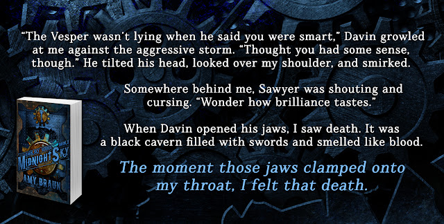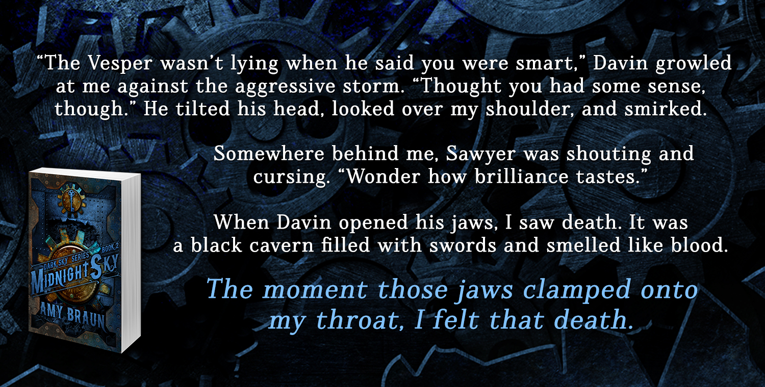 I'm still reeling from the knowledge that I've officially released a full book series. It's exciting, uplifting, and a little sad. I've been on some great adventures with Constance, Dro, Warrick, Sephiel, and Max, and I'm sad to see them go. Still, I've learned a lot from the experience, and know that I can use the knowledge to improve myself as an author. Besides, there's another story to be told: Midnight Sky, the second Dark Sky novel, had its official cover reveal on Sunday, and I couldn't be happier with the work Deranged Doctor Design put together.